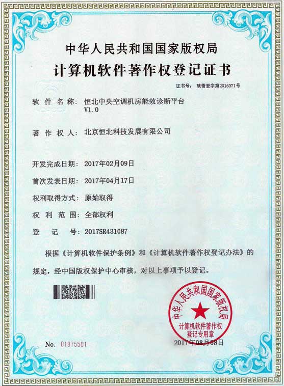 北京恒北科技发展有限公司开发的《恒北中央空调机房能效诊断平台V1.0》软件,于2017年8月8日获得中华人民共和国国家版权局颁发的《计算机软件著作权登记证书》证书号:软著登字第2016371号